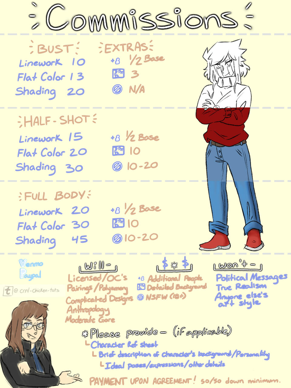 All listed prices are the base price. Be aware that the price may increase depending on additional details and the complexity of the commission.